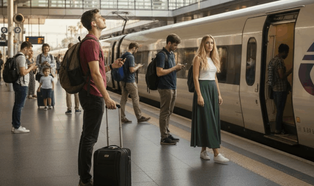 Reisende steigen in einen Zug